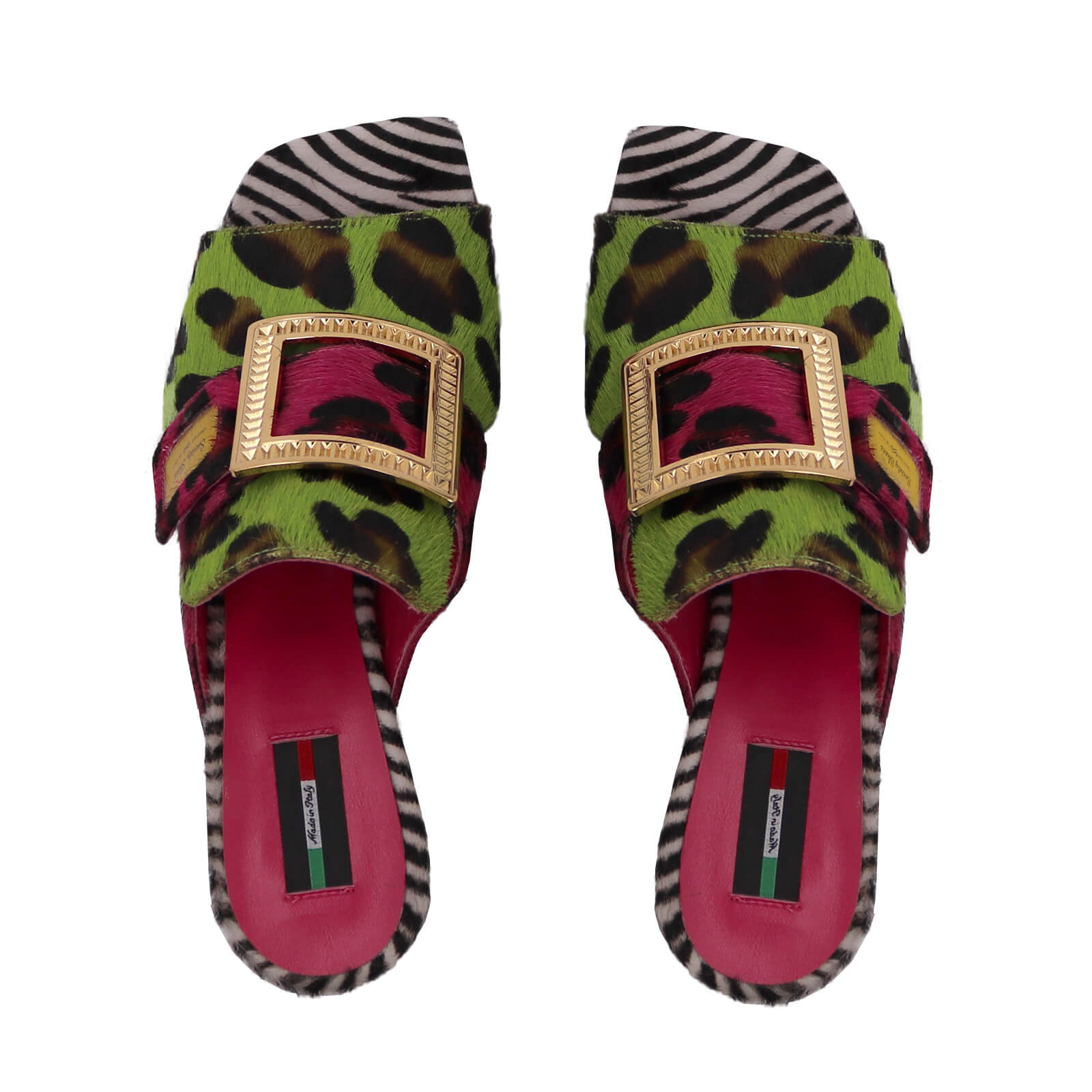 Handcrafted in Italy, this luxe sandal showcases an open toe, wide ankle strap, and a sculpted chunky square heel—giving you both height and stability. The triple-print clash is loud, proud, and ready to turn sidewalks into runways.